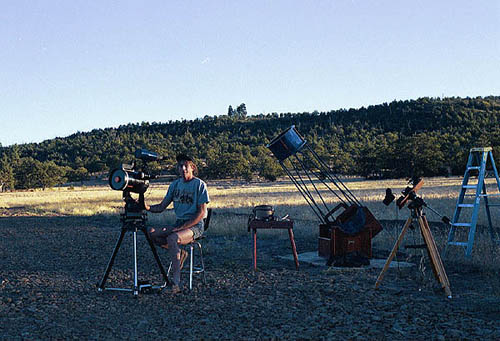 This is a few of my toys. The blue one is a 17" that I built a couple years ago. The wood is 120 year old pine salvaged from the upstairs of my house. The mirror was hand ground and polished and is silver coated. The others are a C-8 with extras and a Great Polaris mount and platform for cameras. This are just of few of the telescopes I own and have built. Wait until you see the next one! This picture was taken on August12th, 2002, in the hills above Goldendale in the Southern desert country of Washington.
